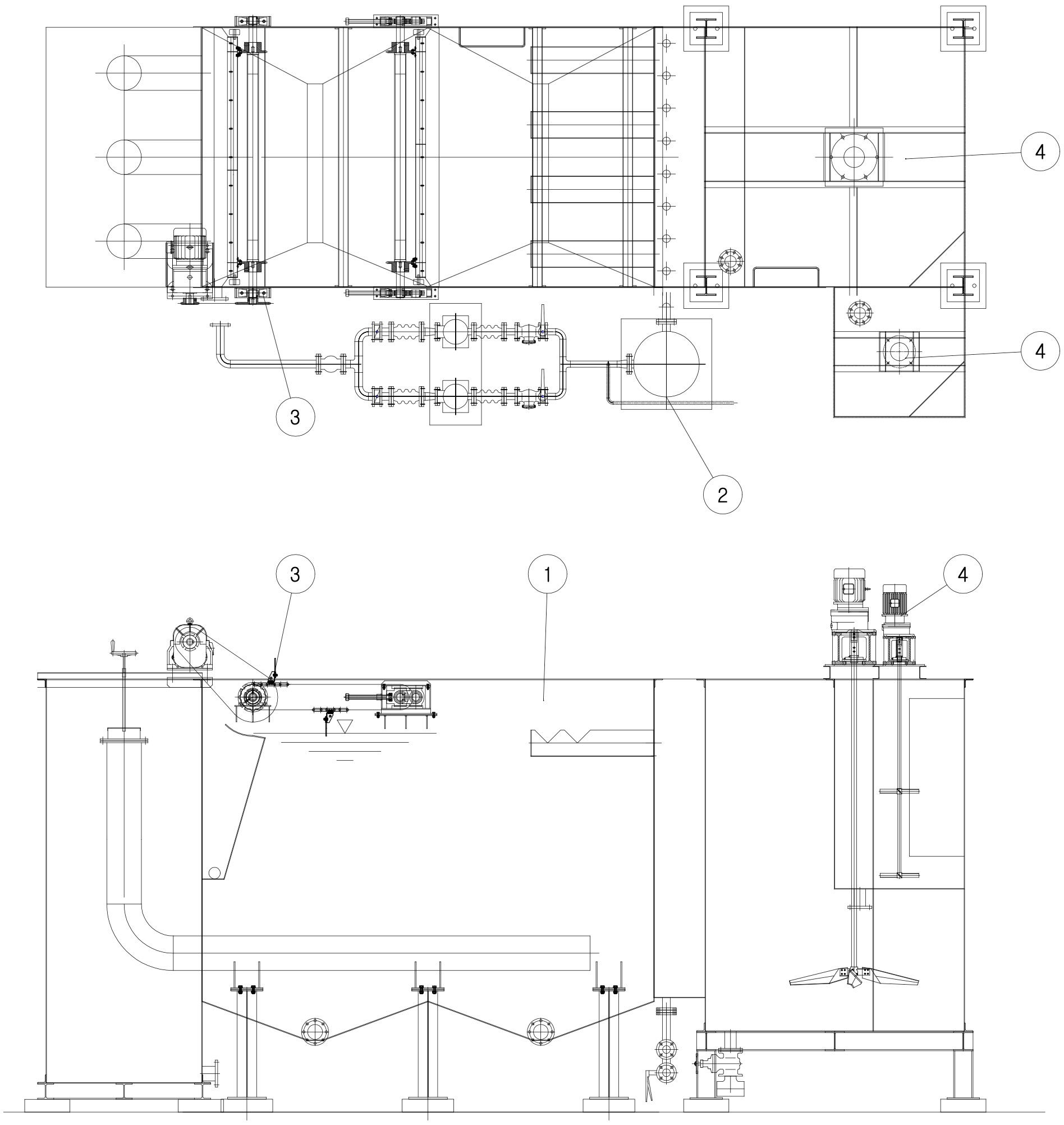 (1)부상조 탱크 (2)공기주입장치 (3)부유물 스크래퍼 (4)교반기